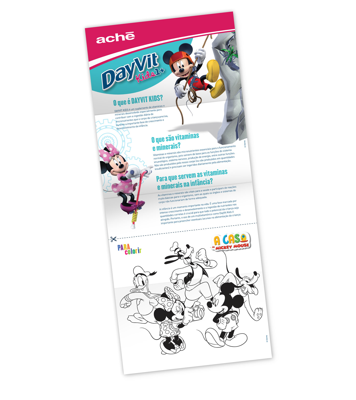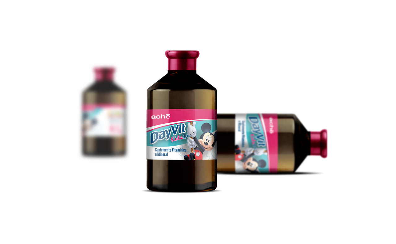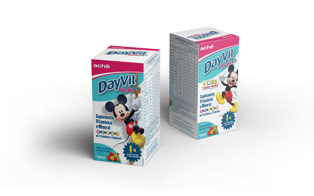 Criação da identidade visual, cartucho, rótulo e folheto explicativo do produto DayVit Kids 1+ para a Ache Laboratórios com a aplicação do Mickey Mouse como personagem licenciado Disney ©.